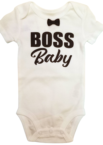 Unique design graphic baby onesie for the new Boss in the family! Bow tie detail adorned above distinctive text.