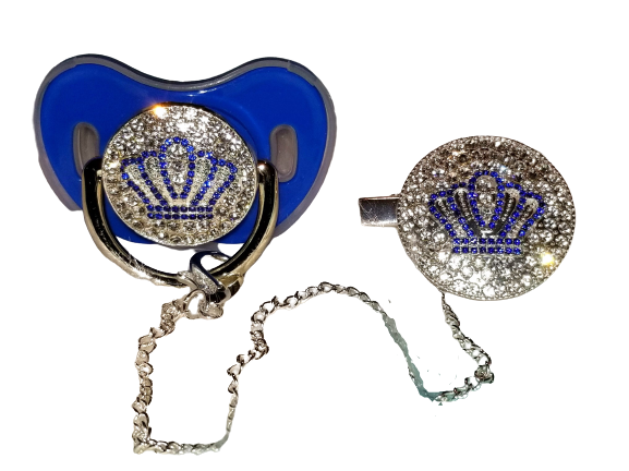 This crystalized pacifier, featuring a feeding cap and matching clip, will be sure to give your baby a luxe look. Each set is handcrafted in a unique design that can be easily cleaned and attached to baby's clothing. Available in 0-6 and 6-18 month nipple sizes, this binky set will make the perfect gift and keepsake for any precious child.