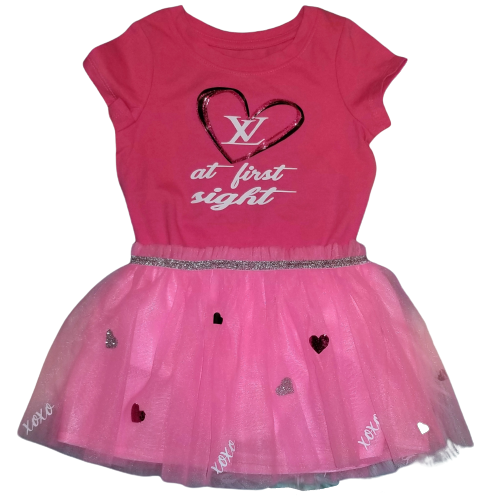 You will be in "Love At First Sight" seeing your toddler in this custom embellished Valentine-themed set. Featuring a luxury-inspired graphic on the shirt with a matching pink tutu skirt adorned with shimmering hearts and "xoxo" text detail trim around the , this outfit will make a picture perfect look for this beloved holiday.