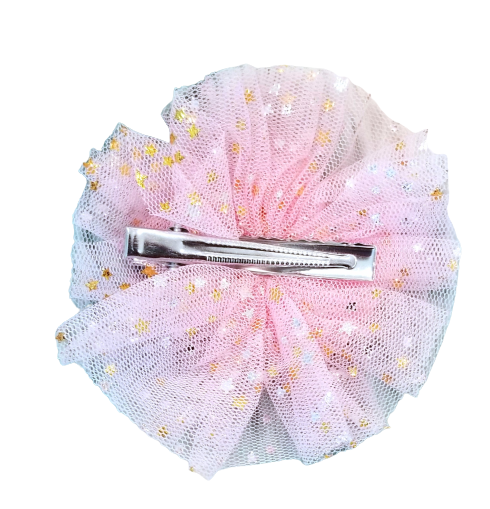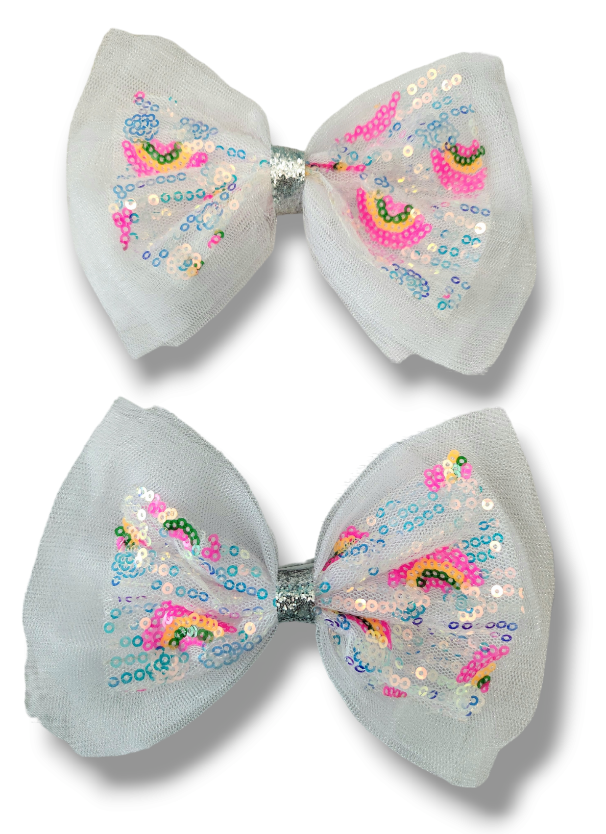 Your lil princess' crown will look royal in this pair of sequined bows adorned with a rainbow print and tulle detailing.